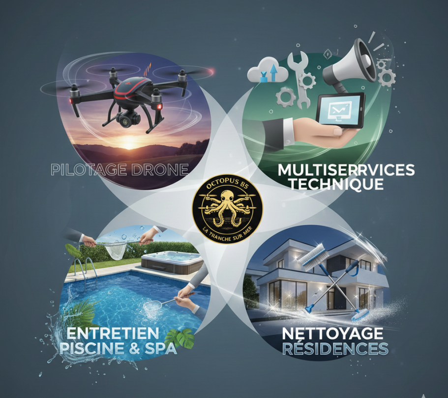 Localisée à La Tranche-sur-Mer (85360), Octopus 85 est bien plus qu'une entreprise de services, elle est spécialisée dans la maintenance des espaces aquatiques, le multiservice / nettoyage de résidences et pour le nettoyage aérien de toiture, façade et d’infrastructure difficiles d’accès.